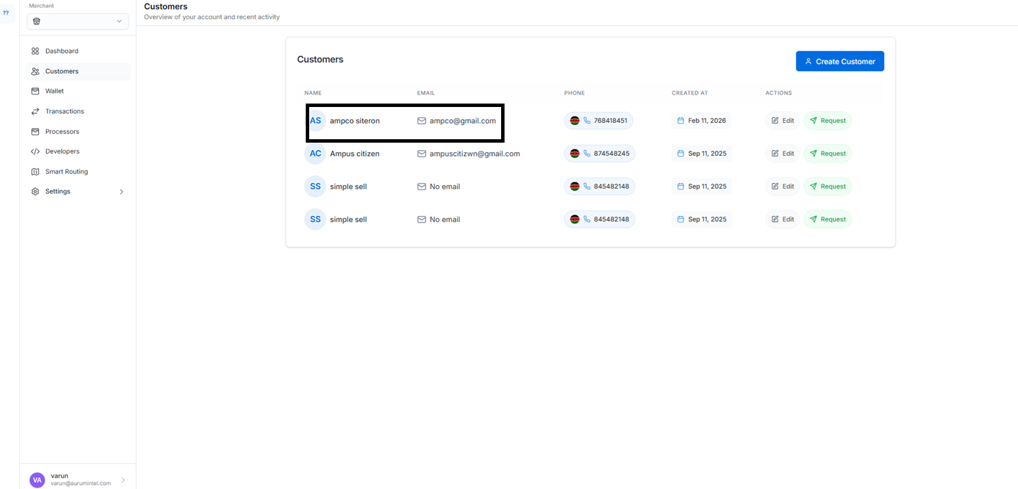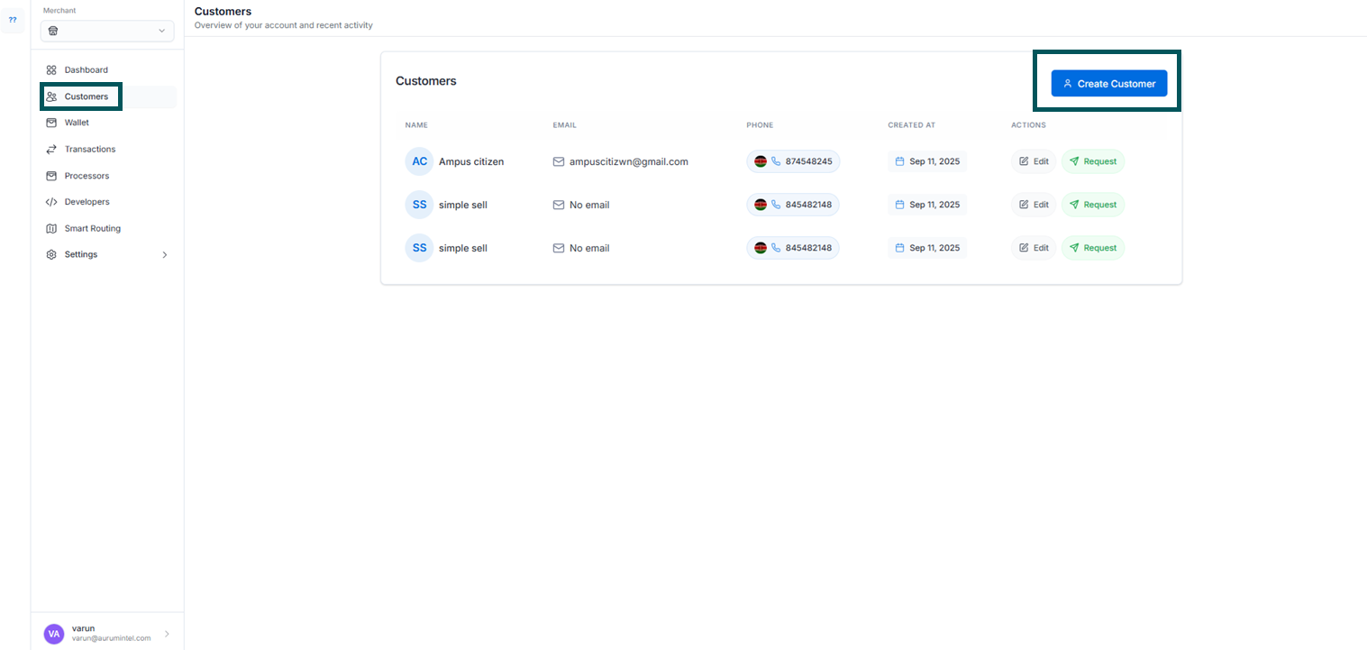 The Customers feature allows you to store and manage profiles for individuals or businesses that make payments to you. Create reusable customer records to simplify checkout, enable recurring billing, and track customer-specific analytics.Creating customers