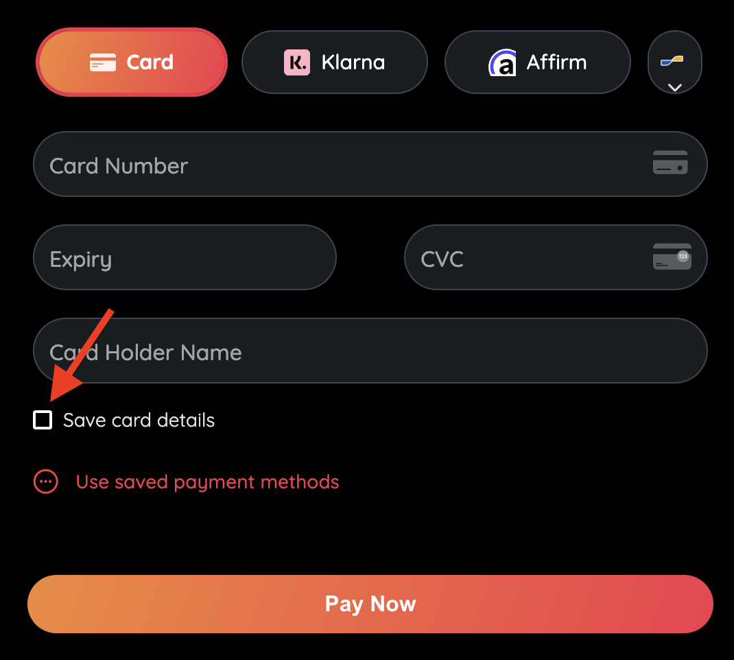 To improve conversion rates and eliminate friction for the customer during checkout, you can save the customer’s card so that they wouldn’t have to enter the card details every time. This also minimises the risk of the customer entering incorrect card details.