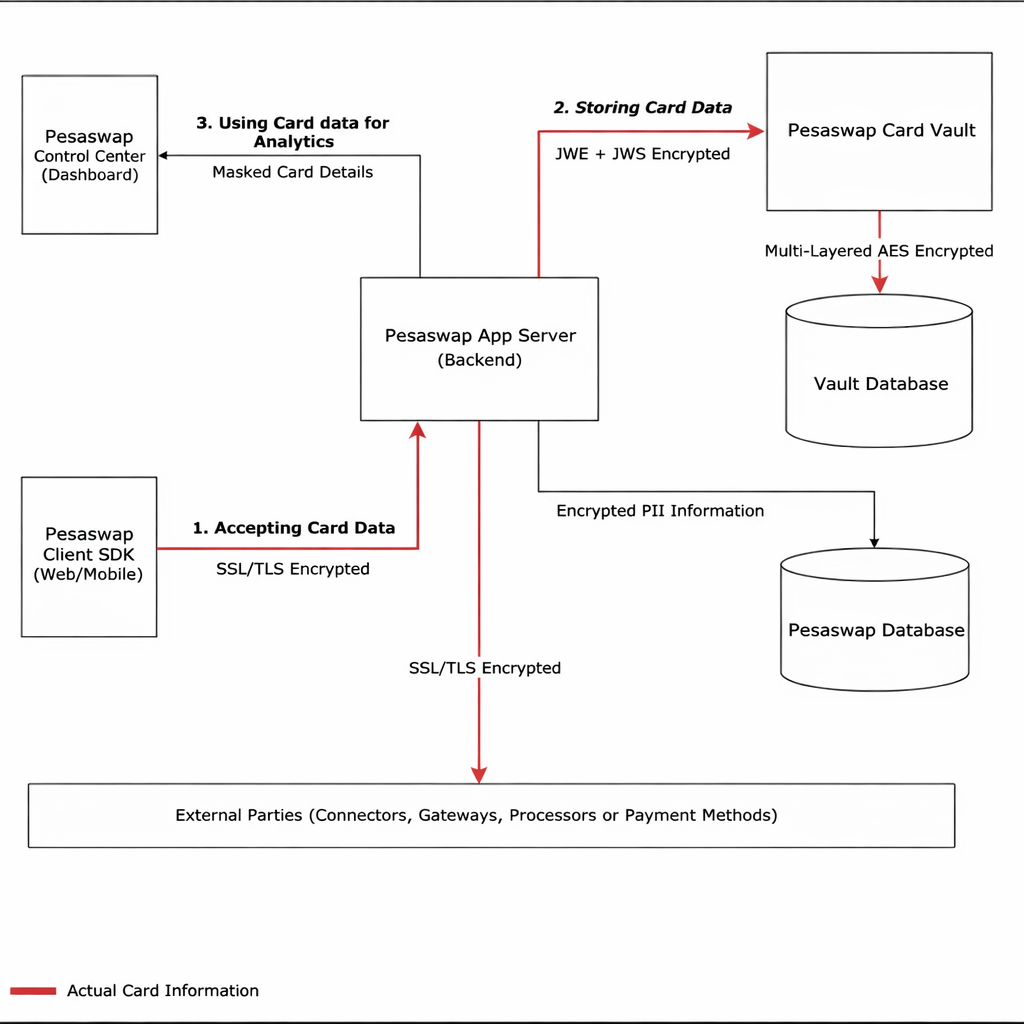 Card information is initially received from the Pesaswap SDK. This data is encrypted using SSL/TLS protocols, ensuring end-to-end encryption during transmission between the SDK and the Pesaswap backend. This guarantees that sensitive card data is secure from the point of collection.2. Storing Card Data (Vaulting)